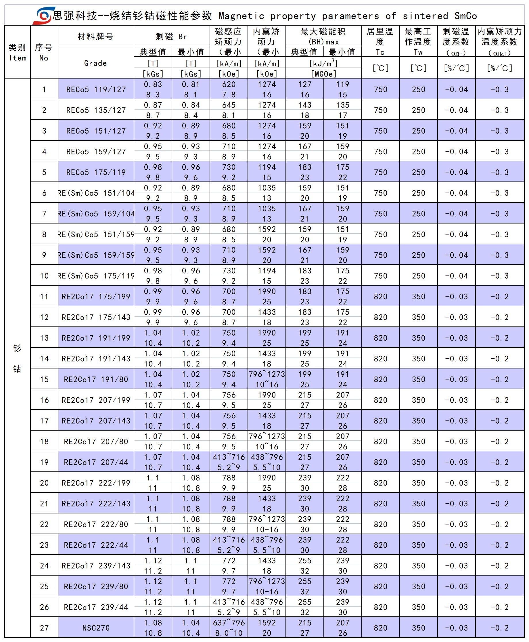 釤鈷永磁體其主要特點(diǎn)是磁性能高,溫度性能好。最高工作溫度可達(dá)250-350 攝氏度。與釹鐵硼磁鐵相比,釤鈷磁鐵更適合工作在高溫環(huán)境中。很適合用來制造各種高性能的永磁電機(jī)及工作環(huán)境十分復(fù)雜的應(yīng)用產(chǎn)品。思強(qiáng)公司所生產(chǎn)的高性能釤鈷永磁體:Br>11.5kGs,Hcj>25kOe,(BH)max>31MGOe。
